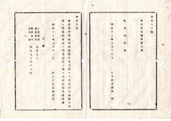 • 解説 N25090178○明治布告布達 ○北海道 山越郡長万部駅より寿都郡中歌駅の間、道路更生に付里程更生 長万部~黒松内 5里7丁 黒松内~中歌 4里9丁余 開拓長官黒田清隆○明治12年 栃木県○和本古書古文書