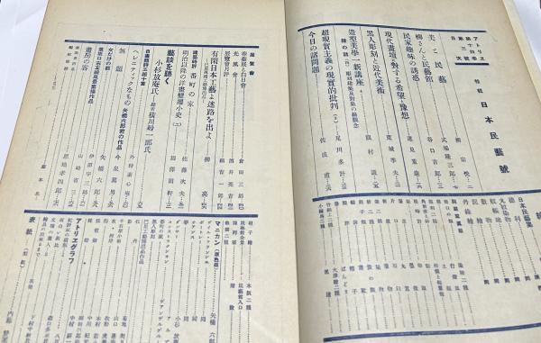 • 解説 ヤケ 表紙少傷み、印消し跡(他にはない) 裏表紙縁傷み、欠けあり 背傷み補修 図版欠無し 80頁 柳宗悦「美と民藝」、式場隆三郎「柳さんと民藝館」、谷口吉郎「民家趣味の誘惑」等 芸談を訊く:小杉放菴 表紙は型紙の写真 B5判
