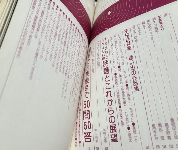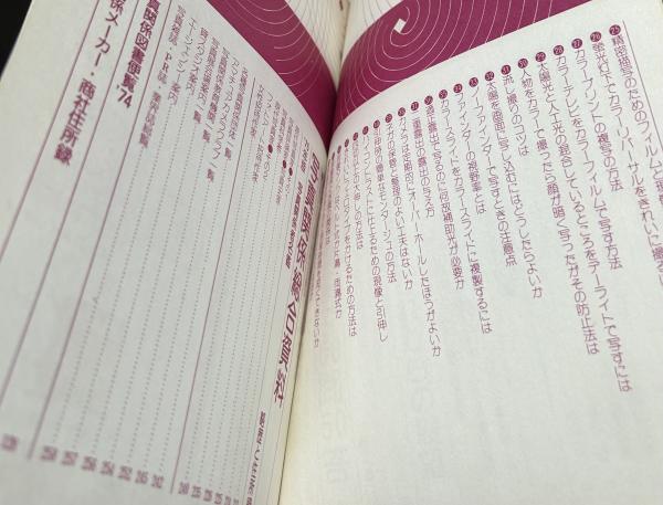 • 解説 特別企画① 秋山庄太郎 人と作品 私の半生を語る 特別企画② 林忠彦 私の半生を語る 1974年・話題の作品〈写真雑誌・写真集〉 '74年・カメラとフィルムの話題とこれからの展望 撮影から現像まで50問50答 写真関係者名鑑(略歴と住所) 少経年ヤケ 274頁 B5 昭和49年12月刊