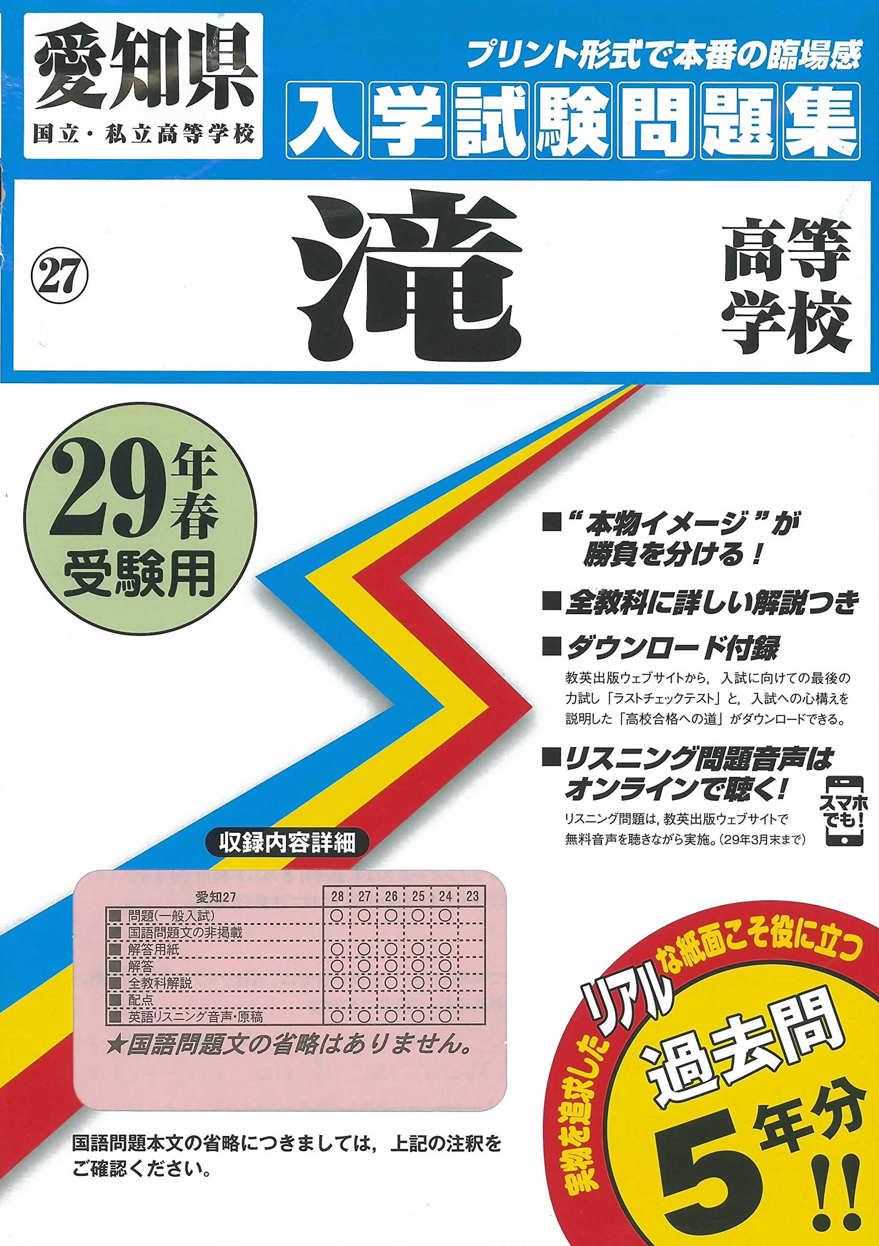 滝高等学校過去入学試験問題集平成29年春受験用(実物に近いリアルな紙面のプリント形式過去問5年分) (愛知県高等学校過去入試問題集)