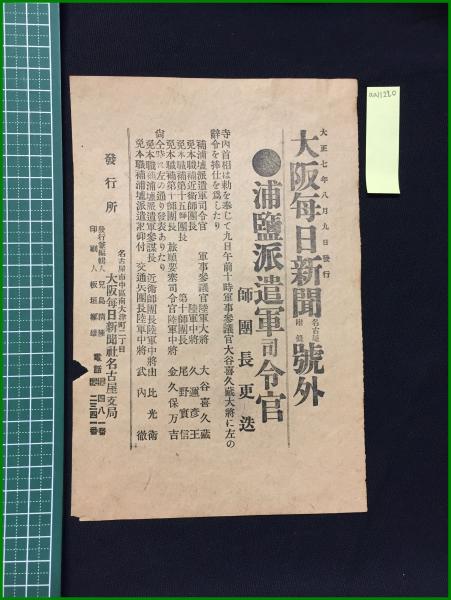 【大阪毎日新聞 大正7年8月9日 号外】【捕監派遣軍司令官】