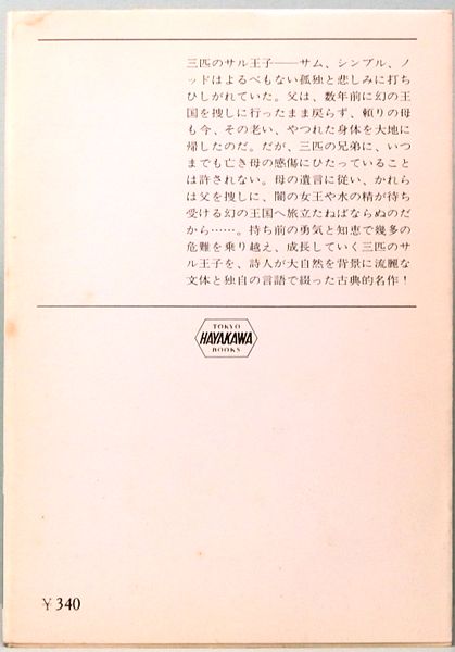 • 解説 【持ち前の勇気と知恵で幾多の危難を乗り越え、成長していく三匹のサル王子を、詩人が大自然を背景に流麗な文体と独自の言語で綴った古典的名作!】初版、文庫サイズ、ソフトカバー、296p、本体:三方にヤケと汚れ有り、本文:ヤケ有り、カバー:汚れ有り