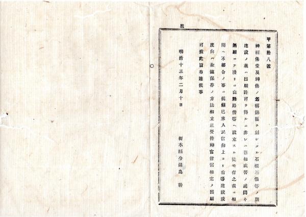 • 解説 N25092615明治布告布達 ○人民信仰上永久保存の神祠仏堂及神仏名称を刻したる石標石仏等建設の出願方 栃木県令鍋島幹○明治13年 栃木県布達○和本古書古文書