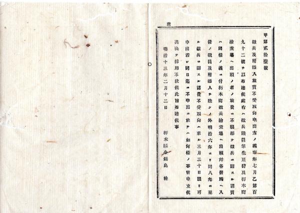 • 解説 N25092619明治布告布達 ○徴兵検査場出頭并営所入営の者を除き、明治6~8年 徴兵に関する諸費用を不受取者申出方日限 栃木県令鍋島幹○明治13年 栃木県布達○和本古書古文書