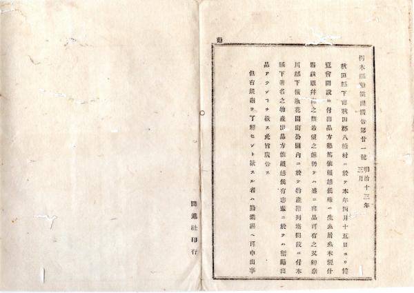 • 解説 N25092626明治布告布達 ○秋田県八橋村(現秋田市)に於て4月より博覧会開設○神奈川県横浜花園町公園内に於て物産陳列場開設 県下物産奮励出品 栃木県勧業課告○和本古書古文書