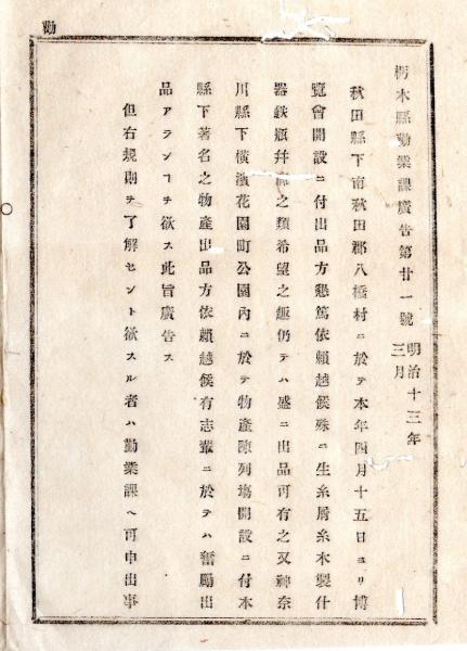 明治布告布達 ○秋田県八橋村(現秋田市)に於て4月より博覧会開設○神奈川県横浜花園町公園内に於て物産陳列場開設 県下物産奮励出品 栃木県勧業課告○和本古書古文書