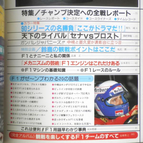 特集/チャンプ決定への全線レポート カラー特集/90シリーズの名勝負「ここがドラマだ!!」 天下のライバル「セナVSプロスト」 特別企画/鈴鹿の観戦ポイントはここだ 「メカニズムの芸術」F1エンジンはこれだけある F1がゼ~ンブわかる20の話題 完全アルバム/観戦を楽しくするF1チームのすべて 他