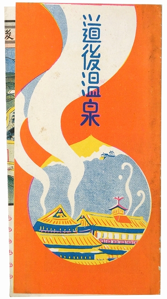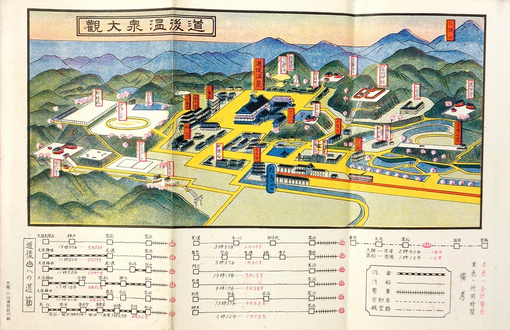 • 解説 鳥瞰図「道後温泉大観」入。裏面は道後温泉案内。大正11年に昭和天皇(当時は摂政宮)が道後温泉を台覧された旨の記載あり。