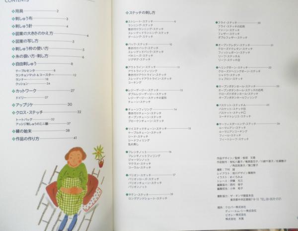 用具 刺しゅう布 刺しゅう針 図案の大きさのかえ方 図案の写し方 刺しゅう枠の使い方 糸の扱い方・刺し方 自由刺しゅう カットワーク アップリケ クロス・ステッチ 縁の始末 作品の作り方 ステッチの刺し方