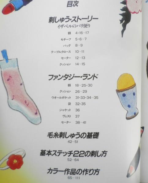 刺しゅう・ストーリー/イザベルのパリ便り 額 モチーフ バッグ テーブルクロース セーター クッション ファンタジー・ランド 額 クッション ウオールポケット 袋 ジャケット ヴェスト セーター 毛糸刺しゅうの基礎 基本ステッチ22の刺し方 カラー作品の作り方