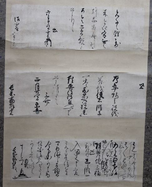 • 解説 十六×五十一糎 十七、五×五十三糎 十六×四十八糎 保存良 細川幽斎・忠興・忠利の書状を、一幅に合装したもの。忠興の書状には青のローマ字印が押されている。忠興と忠利が宛てた長岡勘解由は、家老の長岡(沼田)延元。