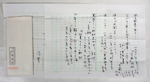 矢島渚男書簡 川名大宛 筆ペン書四百字詰二枚 封付 俳句作品につての問合せの返事