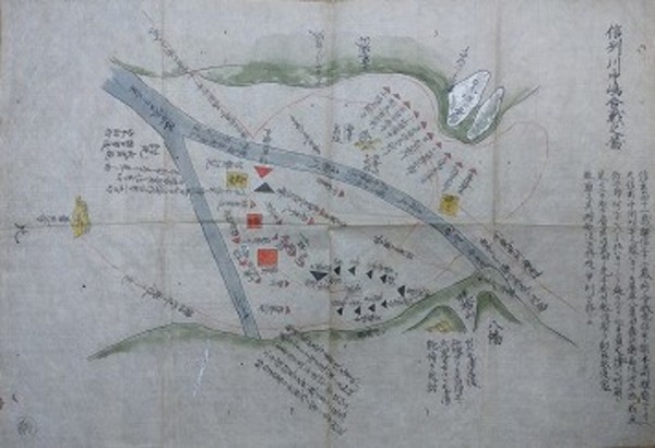 • 解説 彩色写図[信玄41歳謙信32歳ノ時ノ合戦也、、、]  29×41㎝ ※虫損少、折跡