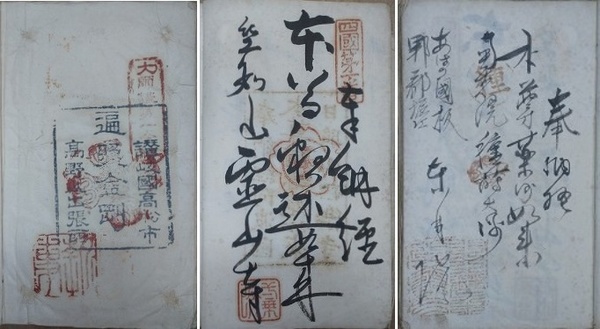 • 解説 第1頁に第一番札所「霊山寺」、最後の頁に「高野山別院高野山出張所」 ※88ヵ所の内、18番から28番、60番、80番の朱印が欠、他に蓮華寺、地蔵院、光明庵、杖杉庵などの番外の寺、19ヵ所の朱印あり、巡礼予定だったであろう札所の白紙の頁あり、番外の寺の19ヵ所は判読出来ない所あり、時代は明記なし、明治期か。