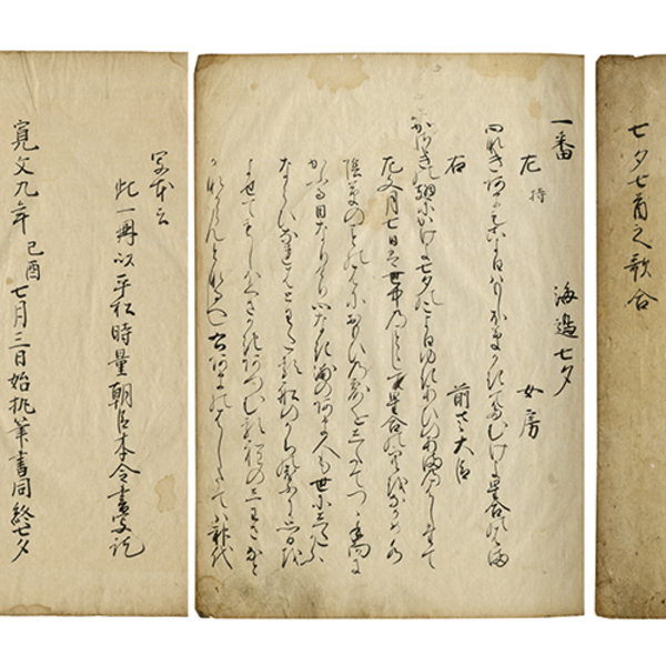 • 解説 一頁11行書 36枚 内題「文明九年七月七日七首歌合」 別題「七夕歌合」 巻末「写本云 此一冊以平松時量朝臣本令書写記 寛文九年己酉七月三日始机筆書同終七夕」 原表紙 24.1×17.8糎 拵帙入 巻末の署名「仁木玄泊書焉[落款]」は後書と思える。