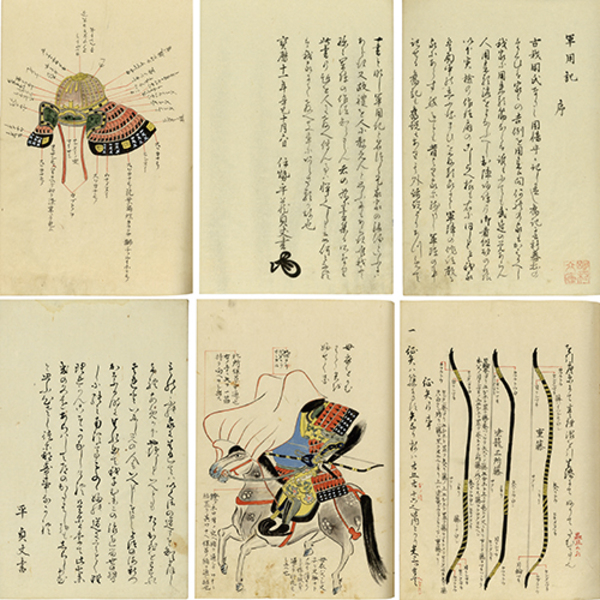 • 解説 乾(序1枚・一19枚・二19枚・三35枚)・坤(四20枚・五26枚・六23枚・七22枚) 手彩図入 武家故実 原表紙 書題簽 27×19.5糎 拵帙入 鎧下装束から小具足、甲冑の種類、威毛大意、太刀・刀・弓矢以下の軍陣用具、馬具、旌旗、陣中調度と軍陣作法にわたる解説書としたもの。序「古我同氏なりし因幡守か記し置し奮記に云旗幕抔の~我家にて数へき事にあらさるが故也 宝暦十一年辛巳十月六日 伊勢平蔵貞丈書(花押)」、七巻末「ものゝふの家に生まれてハいくさの道こそ知らまほし~此七まきの文をあらはして道のかたはしをもしらしめむと思ふ心さし徒になす事なかれ 平貞丈書」
