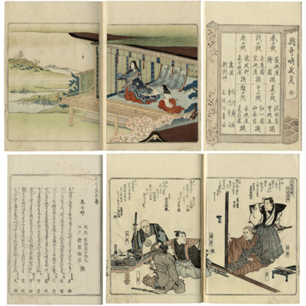 • 解説 47枚表二表三共 彩色刷13図(内見開き11図) 原表紙 22.3×15.9糎 拵帙入 表三「浪速 雪廼屋藏 大坂天神橋通平野町 狂歌摺物月並丁搨 幹事 志保山喜祐」 紙数詳細・・・表二表題1枚・巻頭17枚厚様彩色刷13図(内見開き11図)・本文26枚薄様・跋2枚厚様・表三刊行社名1枚