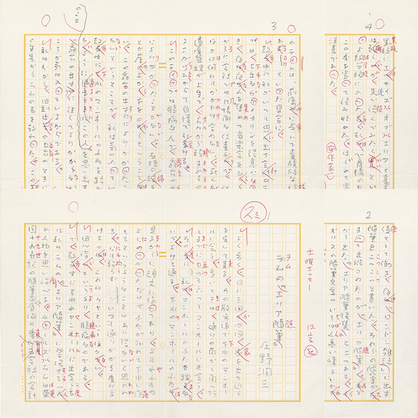 • 解説 『ラムの「エリア随筆」』 鉛筆400字詰完 欄外に「土曜エッセー」 「よく歩く。日に三回か四回、家を出て近くを歩いて来る。その散歩道で下水のマンホールに会う。多いときは、通りの角から角へ行くまでに五つも六つもマンホールに出会う。~」