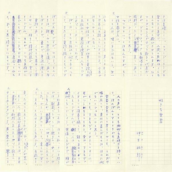 • 解説 『好きな楽器』 ペン200字詰表題共完 「人の声は、とても微妙な表現力を持っていて、ほれぼれとするときがある。楽器の音色として考えてみても、これだけ幅が広くて、変化に富んだものは、ほかに例がない ~」