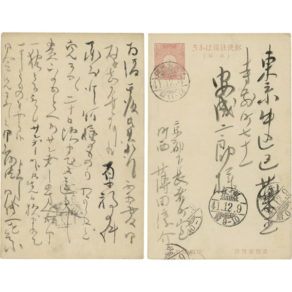 • 解説 安成二郎宛 明治41年12月8日 毛筆8行 署名は本名「淳介」 「~ 原稿の件承知仕候 何種のものかわからねど兎にかく二十日頃までに送るべし 貴方のもとへかサンデーの方へかに ~」