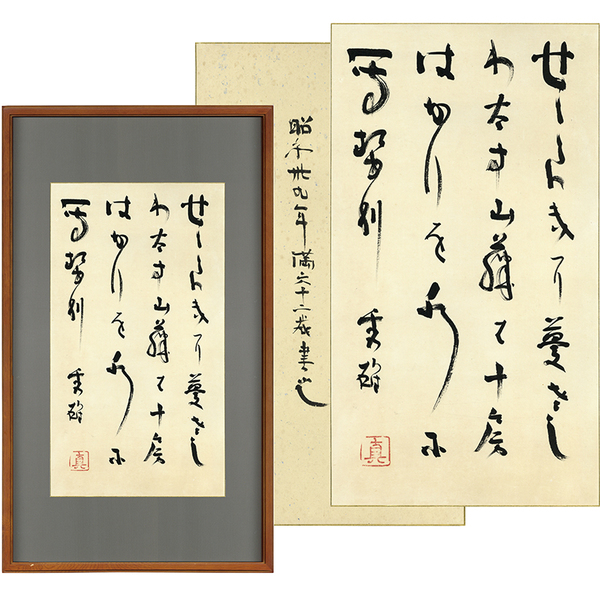 • 解説 『せ々らきに蔓さしわたす山藤は十房はかりを水に写せり 秀雄[落款]』 裏面に「昭和卅九年満六十二歳書也」 紙面48×27糎 額面72.3×42糎