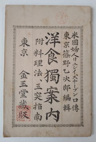 • 解説 ◆送料無料◆明治19年、金玉堂版、菊池辰三 出版人。本文43頁+8頁(序文、口絵)。西洋料理のレシピ・料理方法やテーブルマナー・作法の紹介。玉突き(ビリヤード)の図解・挿画入り指南。【状態】ややヤケ、ややヨゴレ。3ヶ所に古印。裏表紙に1ヶ所シミ跡。
