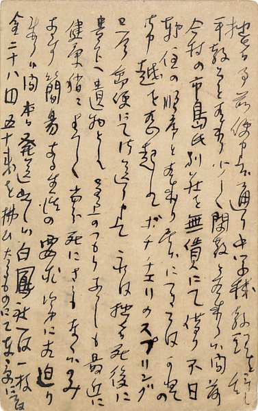 • 解説 伊達俊光宛 ペン書 10行 大11・8・5 宛名は毛筆 早稲田中学教頭を辞し、美術研究に専心する旨。恐らく続きものの「上」のみ。「かねての御申越を想起して、ボチチェリのスプリング、只今郵便にて御送り申上候。これは拙者死後に貴下へ遺物として呈上のつもりなりしも、最近に健康稍々よろしく当分死にさうもなく候のみならず、簡易なる生活の要求次第に相迫り来り候間、本日発送致し候」。(発信地)大阪市東区久太郎町 #八木書店近代自筆物/3.葉書類 #94号近代文学特輯 code08737 ※自筆物につきましては、毎月25日前後に新蒐品を追加しております。PDF形式で御覧になりたい方は https://company.books-yagi.co.jp/archives/news/10928 を参照ください。