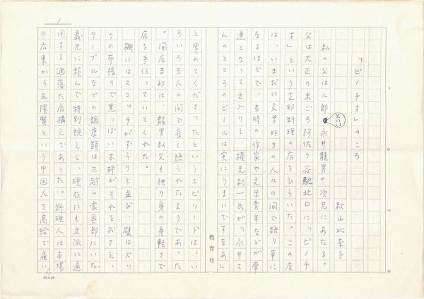 • 解説 『「ピノチオ」のころ』 ペン書 400字詰原稿用紙7枚完 「永井龍男全集2巻月報」(講談社・昭56)掲載。秋山比奈子は阿佐ヶ谷で中華料理屋「ピノチオ」を開いた永井二郞の娘。(種別)回想 #八木書店近代自筆物/1.草稿類 #八木古書2025年3月新蒐 code09489 ※自筆物につきましては、毎月25日前後に新蒐品を追加しております。PDF形式で御覧になりたい方は https://company.books-yagi.co.jp/archives/news/10928 を参照ください。94号目録(R7.1)以後の追加は「#八木古書2025」で検索できます。