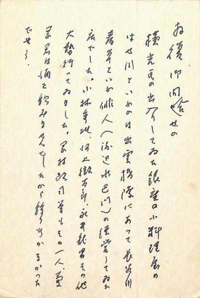 • 解説 竹内多三郎宛 ペン書 8行 昭57・6・5(消印) 住所氏名印 中折 質問への返事。「横光氏の出入りしてゐた銀座の小料理屋のはせ川といふのは出雲橋際にあって長谷川春草といふ俳人(渡辺水巴門)の経営してゐた店でした。小林秀雄、河上徹太郎、永井龍男その他大勢行ってゐました。岡村政司等もその一人。菊岡君は酒を飲みませんでしたから餘り行かなかったでせう」。(発信地)鎌倉市玉縄(受信地)川崎区大島上町 #八木書店近代自筆物/3.葉書類 #94号近代文学特輯 code08542 ※自筆物につきましては、毎月25日前後に新蒐品を追加しております。PDF形式で御覧になりたい方は https://company.books-yagi.co.jp/archives/news/10928 を参照ください。