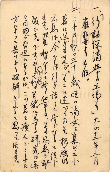 • 解説 國民新聞社學藝部宛 ペン書 9行 大14・10・3(消印) 処女出版について。「一、『行動経済学の立場より』大正十二年二月巌松堂より出版。二、これは私が三十歳頃の論文を集めた小著に過ぎませんが、そこに述べておいた根底的思想は、今なほ行き詰って居らないと信じます。現在私のなして居る仕事は、その思想の発展です」。(受信地)京橋區日吉町 #八木書店近代自筆物/3.葉書類 code08001 ※自筆物につきましては、毎月25日前後に新蒐品を追加しております。PDF形式で御覧になりたい方は https://company.books-yagi.co.jp/archives/news/10928 を参照ください。