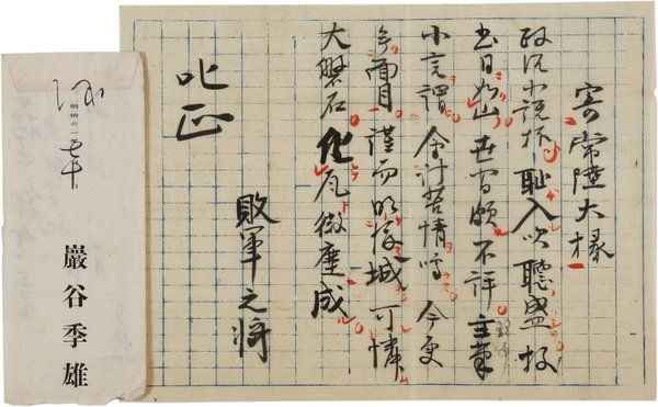 • 解説 堀成之宛 毛筆 原稿用紙8行 封筒付 明31・7・11(消印) 新聞小説で問題があったか。「寄常陸大掾 政治小説杯 耻入吹聴盛 投書日為山 世間頗不評 主筆小言謂 會計苦情鳴 今更無面目 謹而明渡城 可憐大磐石 化瓦微塵成 敗軍之将」。(受信地)中央新聞社 #八木書店近代自筆物/2.書簡類 #94号近代文学特輯 code09415 ※自筆物につきましては、毎月25日前後に新蒐品を追加しております。PDF形式で御覧になりたい方は https://company.books-yagi.co.jp/archives/news/10928 を参照ください。