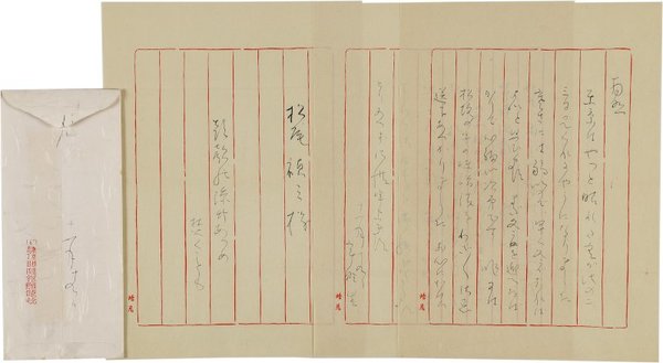 • 解説 松尾禎三宛 毛筆 便箋3枚19行 封筒付 昭46・11・20(消印) 贈答品の礼状。「昨日は松坂牛の味噌漬をわざわざ御恵送にあづかりました お心にかけられて、まことに有難うございます 早速頂戴いたしました この所は芝居の用事とも遠ざかり、机にむかって何かまとめようと思って居ります」。 文末の句は「朝顔の添竹あつめ焚くことも」。(発信地)杉並区西荻北(受信地)名古屋市千草区 #八木書店近代自筆物/2.書簡類 #八木古書2025年9月新蒐 code09858 ※自筆物につきましては、毎月25日前後に新蒐品を追加しております。PDF形式で御覧になりたい方は https://company.books-yagi.co.jp/archives/news/10928 を参照ください。94号目録(R7.1)以後の追加は「#八木古書2025」で検索できます。