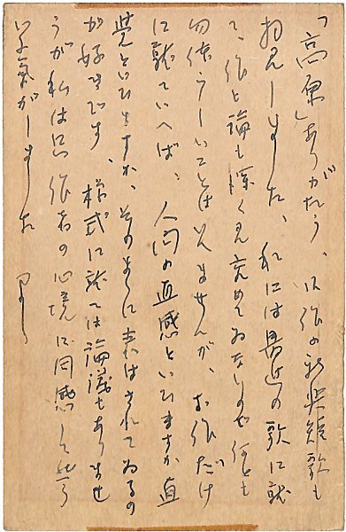 • 解説 友常幸一宛 ペン書 9行 昭7・4・2(消印) 「高原」の献本礼状。「お作だけに就ていへば、人間の直感といひますか、直覺といひますか、そのままに表はされてゐるのが好きです」。(発信地)中目黒(受信地)茨城県岩瀬町 #八木書店近代自筆物/3.葉書類 #94号近代文学特輯 code06903 ※自筆物につきましては、毎月25日前後に新蒐品を追加しております。PDF形式で御覧になりたい方は https://company.books-yagi.co.jp/archives/news/10928 を参照ください。