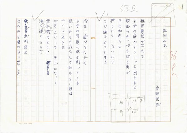 • 解説 『裁判の木』 ペン書 400字詰原稿用紙4枚完 「日本未来派」(201号)掲載。(種別)現代詩 #八木書店近代自筆物/1.草稿類 #94号近代文学特輯 code08692 ※自筆物につきましては、毎月25日前後に新蒐品を追加しております。PDF形式で御覧になりたい方は https://company.books-yagi.co.jp/archives/news/10928 を参照ください。