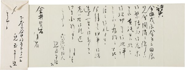 • 解説 金井紫雲宛 毛筆 巻紙15行 封筒付 昭4・3・4(消印) 記事への礼状。「今回戊辰會第二回展覧会開催に際しては御繁忙の処御光栄にも貴紙上に於て御親切なる御批評をたまわり……」。(発信地)下谷区谷中初音町(受信地)麹町区内幸町 #八木書店近代自筆物/2.書簡類 #94号近代文学特輯 code00989 ※自筆物につきましては、毎月25日前後に新蒐品を追加しております。PDF形式で御覧になりたい方は https://company.books-yagi.co.jp/archives/news/10928 を参照ください。