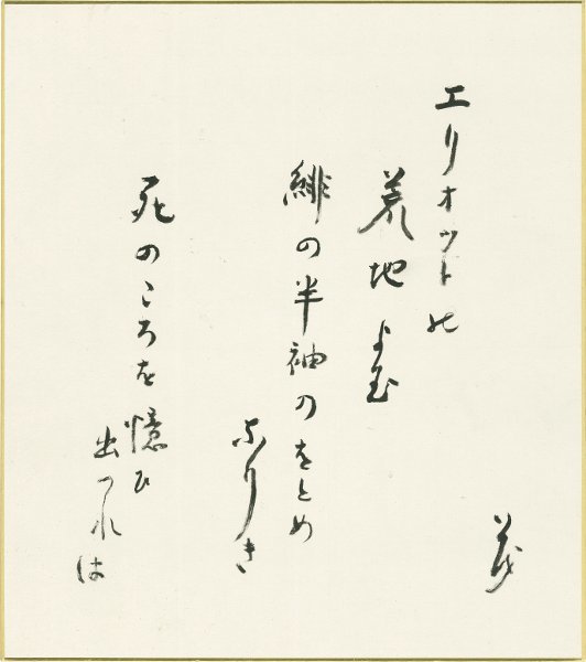 • 解説 エリオットの荒地よむ緋の半袖のをとめなりき死のころを憶ひ出づれば 茂 #八木書店近代自筆物/5.色紙類 #94号近代文学特輯 code07155 ※自筆物につきましては、毎月25日前後に新蒐品を追加しております。PDF形式で御覧になりたい方は https://company.books-yagi.co.jp/archives/news/10928 を参照ください。
