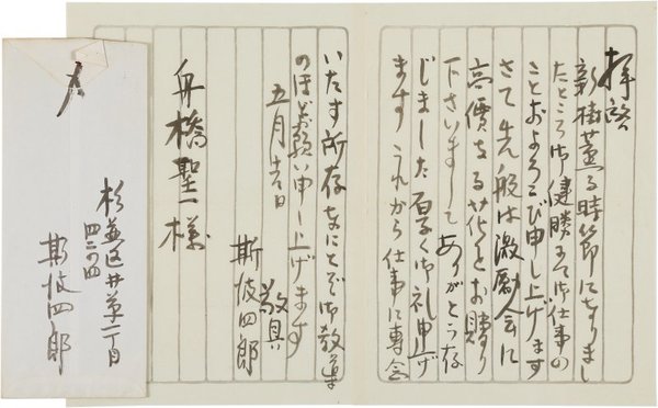 • 解説 舟橋聖一宛 毛筆 便箋2枚14行 封筒付 昭46・5・13(消印) 贈花の礼状。「先般は激励会に高價なる花をお贈りくださいましてありがとう存じました 厚く御礼申し上げます」。(発信地)杉並区井草(受信地)新宿区下落合 #八木書店近代自筆物/2.書簡類 code09818 ※自筆物につきましては、毎月25日前後に新蒐品を追加しております。PDF形式で御覧になりたい方は https://company.books-yagi.co.jp/archives/news/10928 を参照ください。94号目録(R7.1)以後の追加は「#八木古書2025」で検索できます。