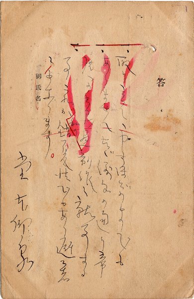 • 解説 「サンデー毎日編輯局」宛 ペン書 6行 昭3・6・12(消印) 折れ 状差し跡 汚れ 「サンデー毎日」が主催したアンケートの返信葉書。質問は「今年の銷夏」(昭3)。「取り立てゝ申すほどのものでもありません たゞ例年の通り帝展への出品畫制作に就事する事 これが銷夏法でもあり避暑でもあります」。(受信地)大阪市北区堂島 #八木書店近代自筆物/3.葉書類 #94号近代文学特輯 code04638 ※自筆物につきましては、毎月25日前後に新蒐品を追加しております。PDF形式で御覧になりたい方は https://company.books-yagi.co.jp/archives/news/10928 を参照ください。