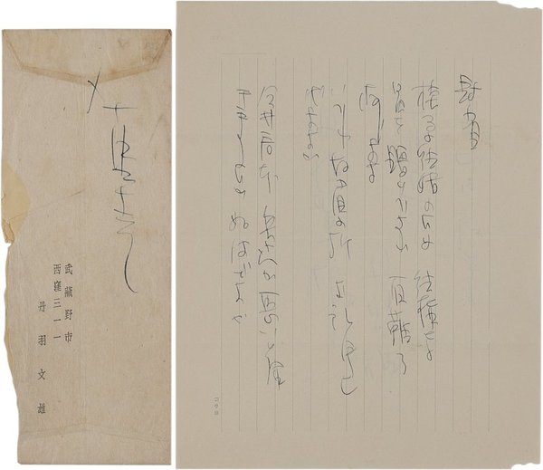 • 解説 舟橋聖一宛 ペン書 便箋2枚12行 封筒付 昭32・10・23(消印) 礼状。「桂子の結婚のため結構な品を贈り下され有難う存じます いづれ拝眉の折お礼申し上げます」。(発信地)武蔵野市西窪(受信地)新宿区下落合 #八木書店近代自筆物/2.書簡類 #八木古書2025年7月新蒐 code09726 ※自筆物につきましては、毎月25日前後に新蒐品を追加しております。PDF形式で御覧になりたい方は https://company.books-yagi.co.jp/archives/news/10928 を参照ください。94号目録(R7.1)以後の追加は「#八木古書2025」で検索できます。