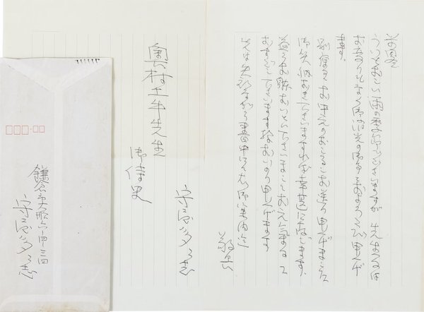 • 解説 奥村土牛宛 ボールペン書 便箋2枚13行 封筒付 昭57・7・9(消印) お中元を贈った旨。(発信地)鎌倉市大船(受信地)杉並区永福 #八木書店近代自筆物/2.書簡類 code05298 ※自筆物につきましては、毎月25日前後に新蒐品を追加しております。PDF形式で御覧になりたい方は https://company.books-yagi.co.jp/archives/news/10928 を参照ください。