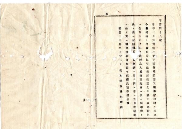 • 解説 N25100103○明治布告布達 ○本年1月芳賀郡の県会議員補欠選挙会 投票日を誤って公告に付無効 補欠選挙会更に開設 栃木県令藤川為親○明治15年 栃木県布達○和本古書古文書