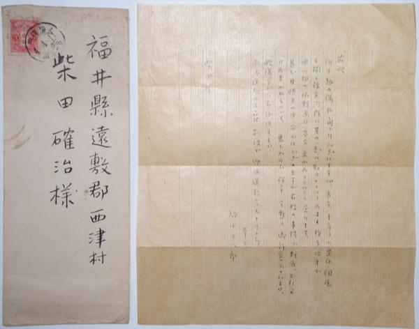 • 解説 柴田確治宛 便箋にペン書7行 封筒付 戦前 書簡の内容の要約:「本年度中は個展を開くため多忙で、依頼の画は、他の方も一切お断りしています。申し訳ございせんが、今回はお引き受けできません。お許し下さい。送っていただいた品は、別便にて返送しておきました」云々 柴田氏は有力な支援者の一人と思われる *封筒の署名と書面の拡大画像有 封筒に経年のヨゴレ