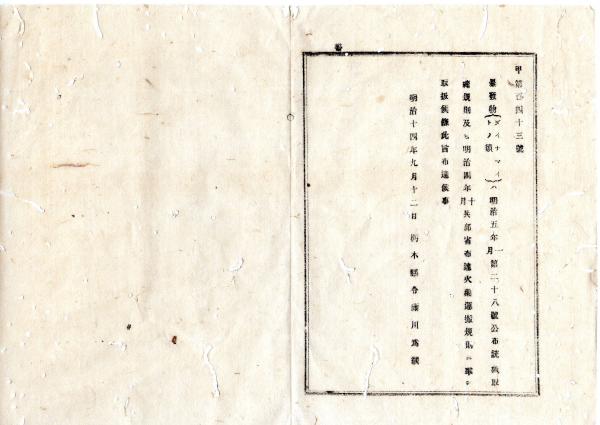 • 解説 N25100117○明治布告布達 明治14年○暴発物(ダイナマイト類)の取扱準拠法令 明治5年布告銃砲取扱規則及び同4年兵部省布達火薬運搬規則に準じ取扱○栃木県布達○和本古書古文書