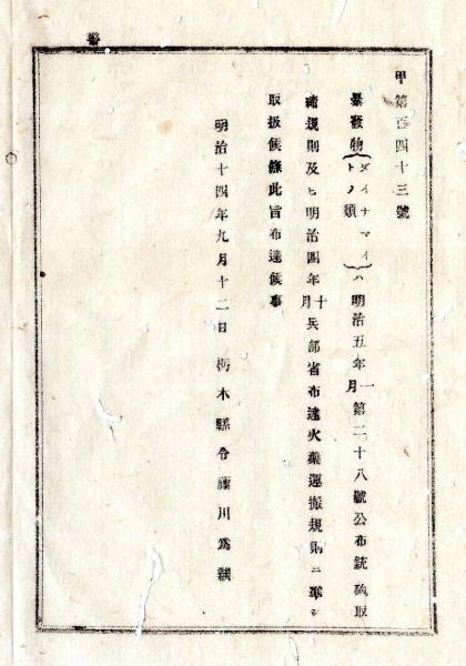 明治布告布達 明治14年○暴発物(ダイナマイト類)の取扱準拠法令 明治5年布告銃砲取扱規則及び同4年兵部省布達火薬運搬規則に準じ取扱○栃木県布達○和本古書古文書