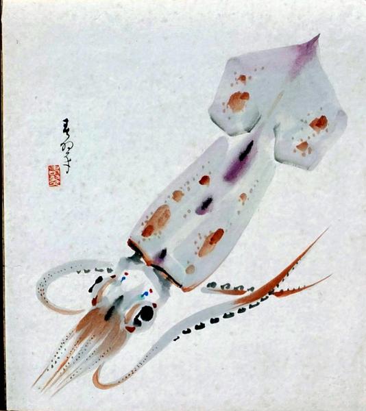 • 解説 D25100503〇彩色木版画画 色紙 烏賊の図 樺山春翠 昭和年代〇和本古書古文書〇和本古書古文書