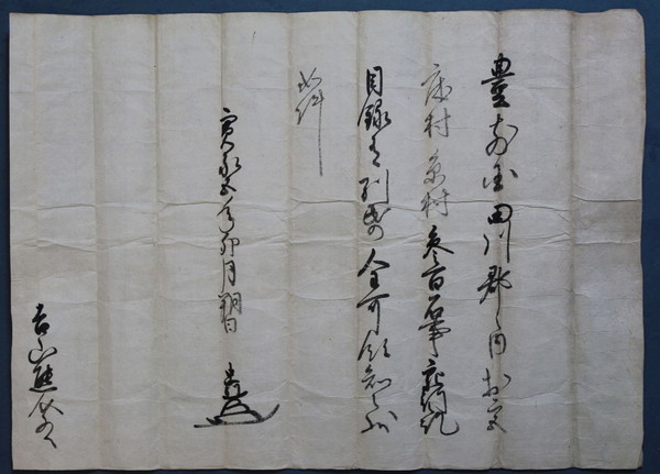 • 解説 寛永五年四月一日付 吉山熊介宛 保存良 豊前国田川郡之内於宮」床村糸村参百石事宛行之訖」目録有別紙全可領知之状」如件  寛永五年卯月朔日  忠利(花押)   吉山熊介殿            豊前小倉藩時代に出された宛行状。吉山熊介は細川家が肥後に国替えになった後、御小姓組・三百石で仕えている。宮床村は金田手永に属し、明治に川宮村の一部となり、現在田川市の大字となる。糸村は猪膝手永に属し、明治に位登村となり、現在田川市の大字となる。