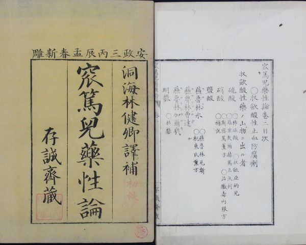 • 解説 安政三年刊 原装原題簽 オランダ人ハーンデー・ワトールの著した「薬性論」を、同国人のプラッヘが補校したものを、洞海が訳して新たに補筆したもの。西洋薬物の分類法や使用方法、効能等について解説している。訳者の洞海は豊前小倉出身で、長崎においてオランダ医師、ニーマンに学び、万延元年幕府に召され侍医となる。