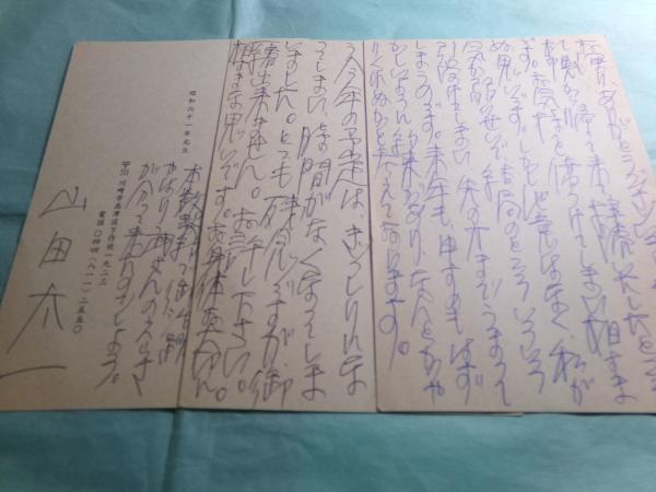 • 解説 山田 太一(脚本家・小説家。やまだ たいち 脚本家・小説家 1934年 - 2023年)の肉筆。ペン書き。郵便葉書3枚。武敬子(たけ けいこ、レビドラマ・映画のプロデューサー1930年 - 2019年)宛