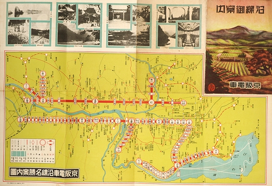 • 解説 京阪電車沿線名勝案内図、沿線名所御案内(京阪線・宇治線・京津線・新京阪線・嵐山線・千里山線・十三線)、他。