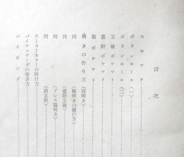 スモック ボタンホール 玉縁ポケット 蓋附ポケット 箱ポケット 明きの作り方/肩明き・後明きの縫ひ方・台付玉縁・ドレス脇明き・前立附 テイラーカラーの附け方 バイヤステープの巻き方 パイピング ほつれ止め 裾の始末 型紙を布に写し方及び切躾の仕方 ブラウスとパンツの縫ひ方 婦人スーツ